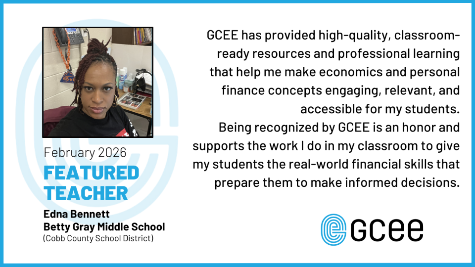 Congratulations to Edna Bennett from Betty Gray Middle School (Cobb County School District) for being selected as our February 2026 Featured Teacher! We appreciate teachers, like Edna, who are making economics and financial literacy come alive for their students.
